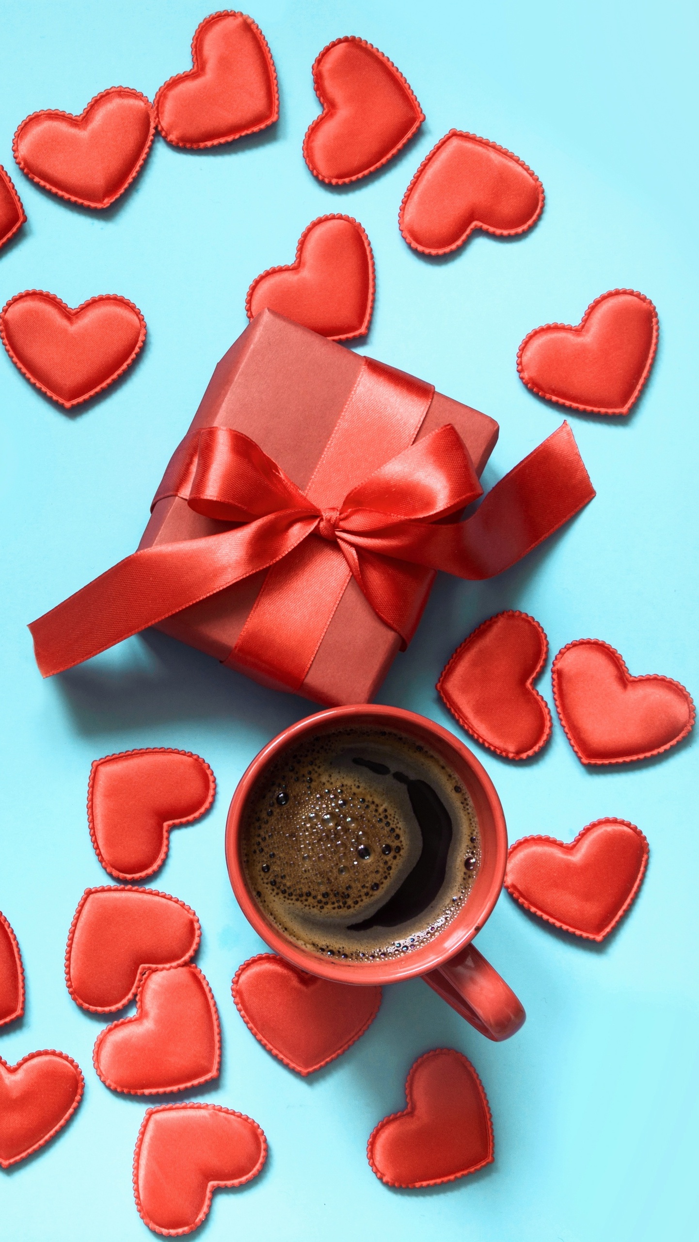 Edytor tapety: Kawa wśród serduszek obok prezentu