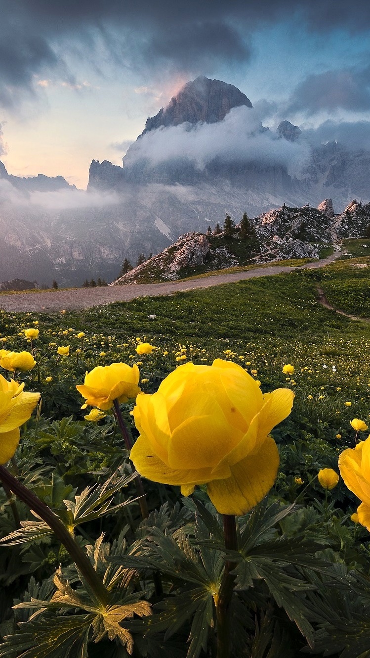 Edytor tapety: Żółte kwiaty i zamglone góry