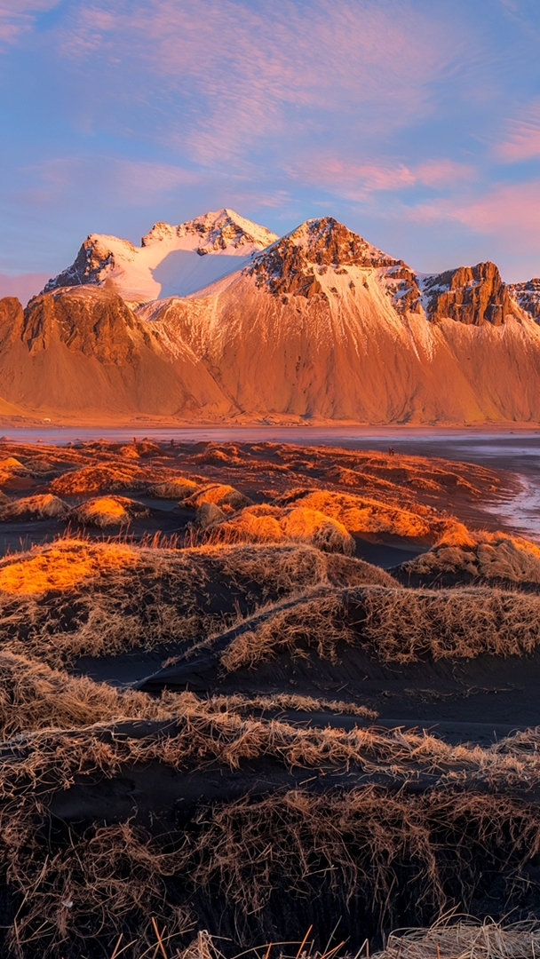Edytor tapety: Rozświetlona góra Vestrahorn i plaża Stokksnes