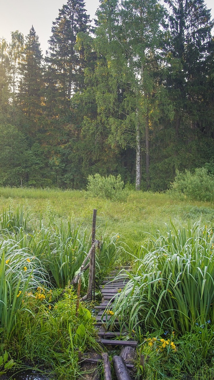 Edytor tapety: Drewniany mostek na mokradłach pod lasem