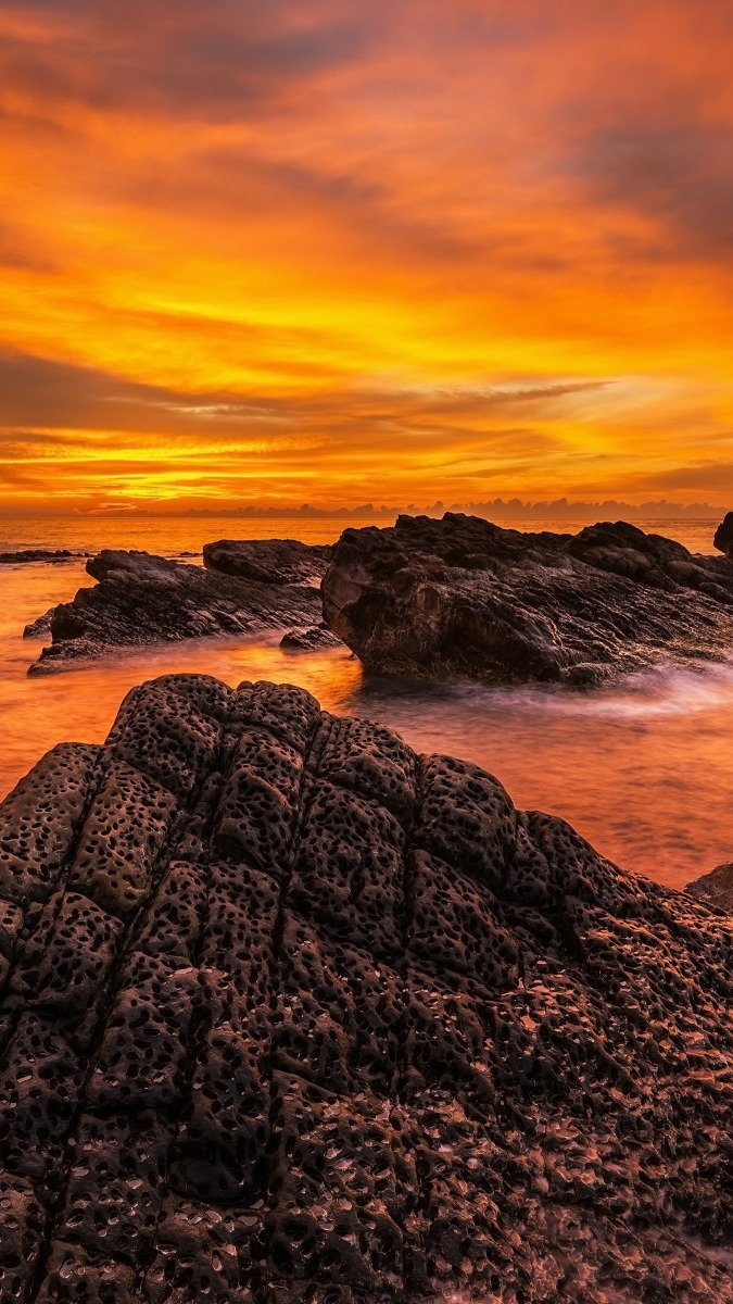 Edytor tapety: Skały w morzu pod pomarańczowym niebem