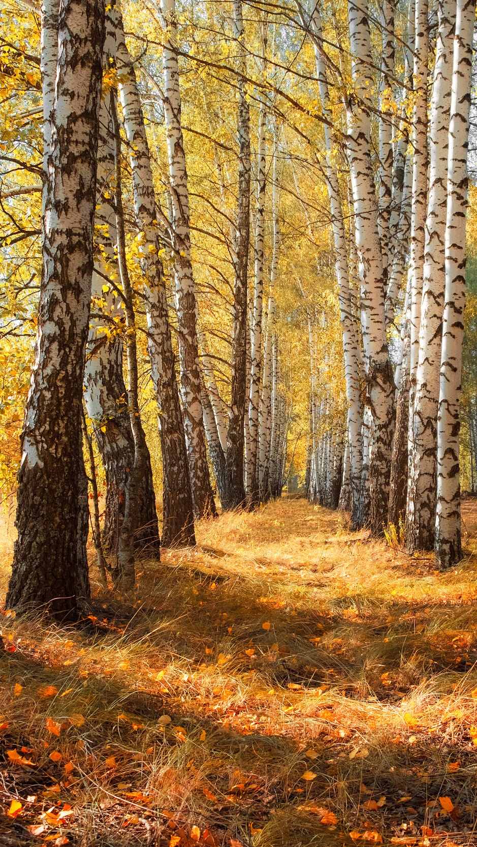 Edytor tapety: Rozświetlone brzozy w jesiennym lesie