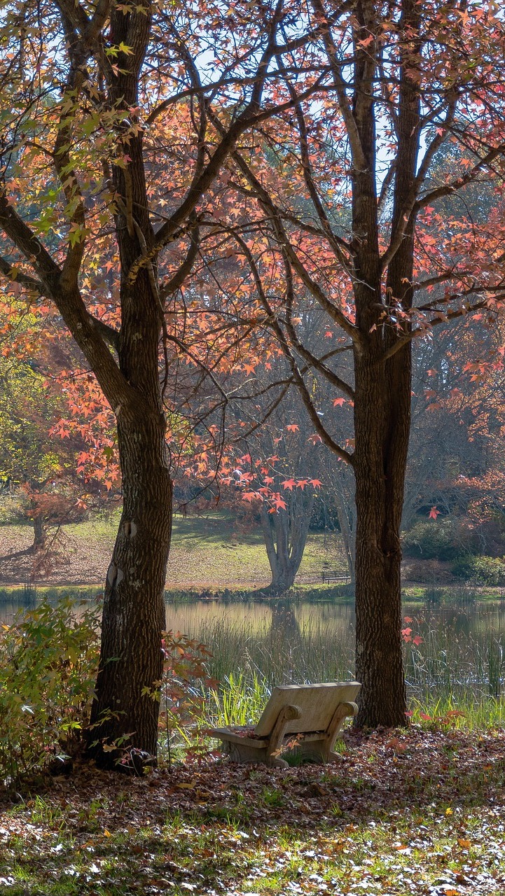 Edytor tapety: Ławka pod drzewami nad stawem