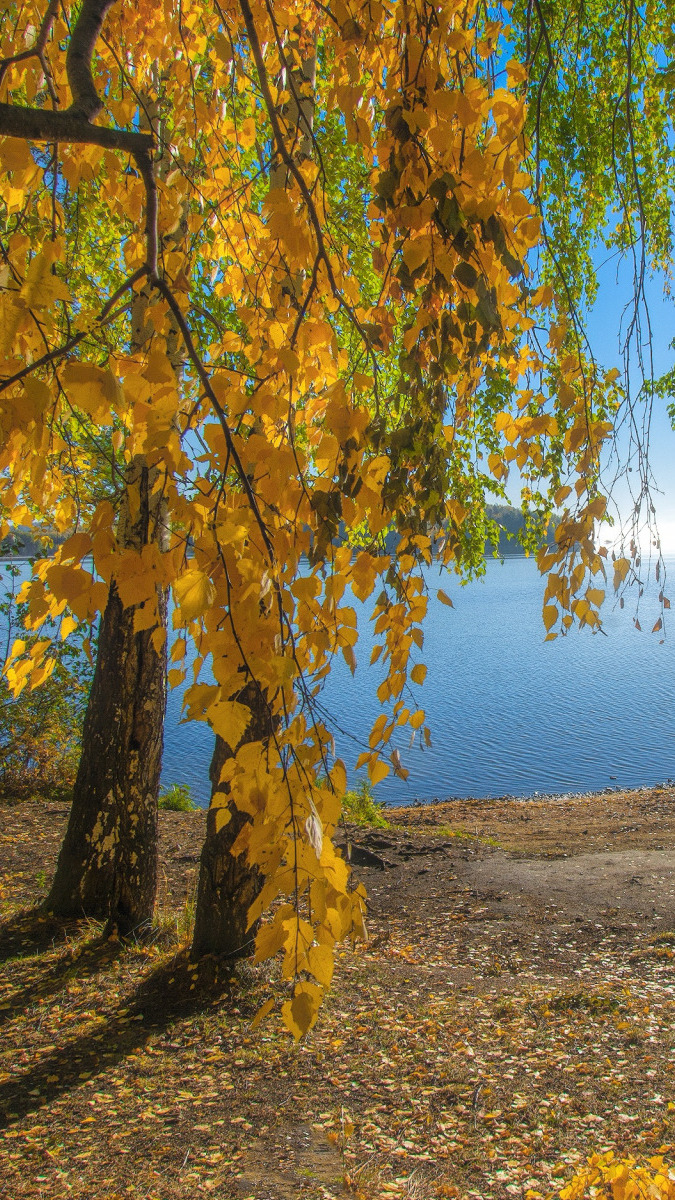 Edytor tapety: Rozświetlone brzozy nad jeziorem