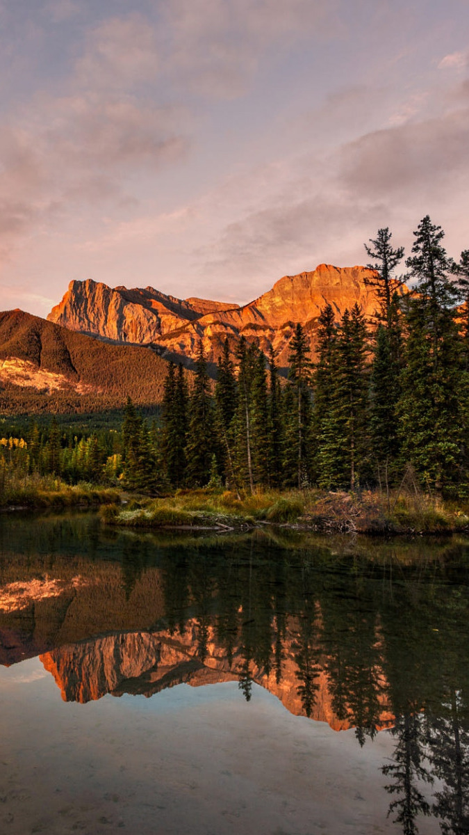 Edytor tapety: Odbicie rozświetlonych gór w jeziorze