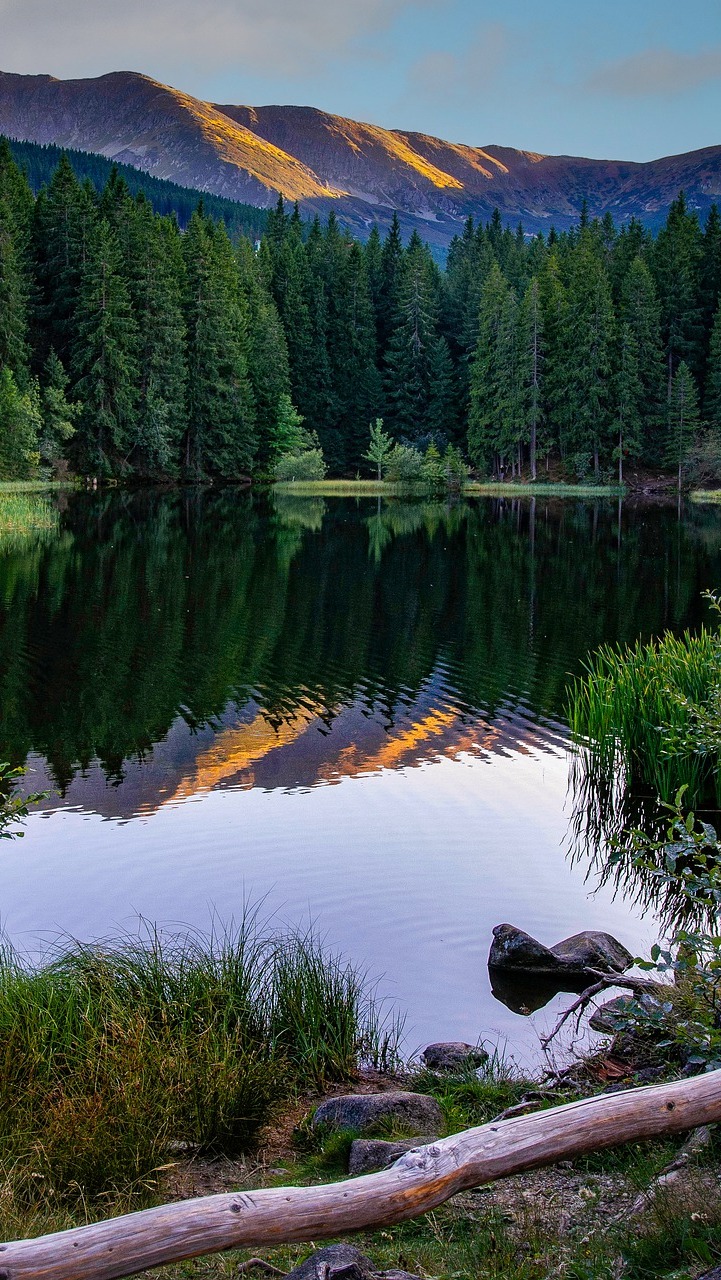 Edytor tapety: Góry i las nad jeziorem