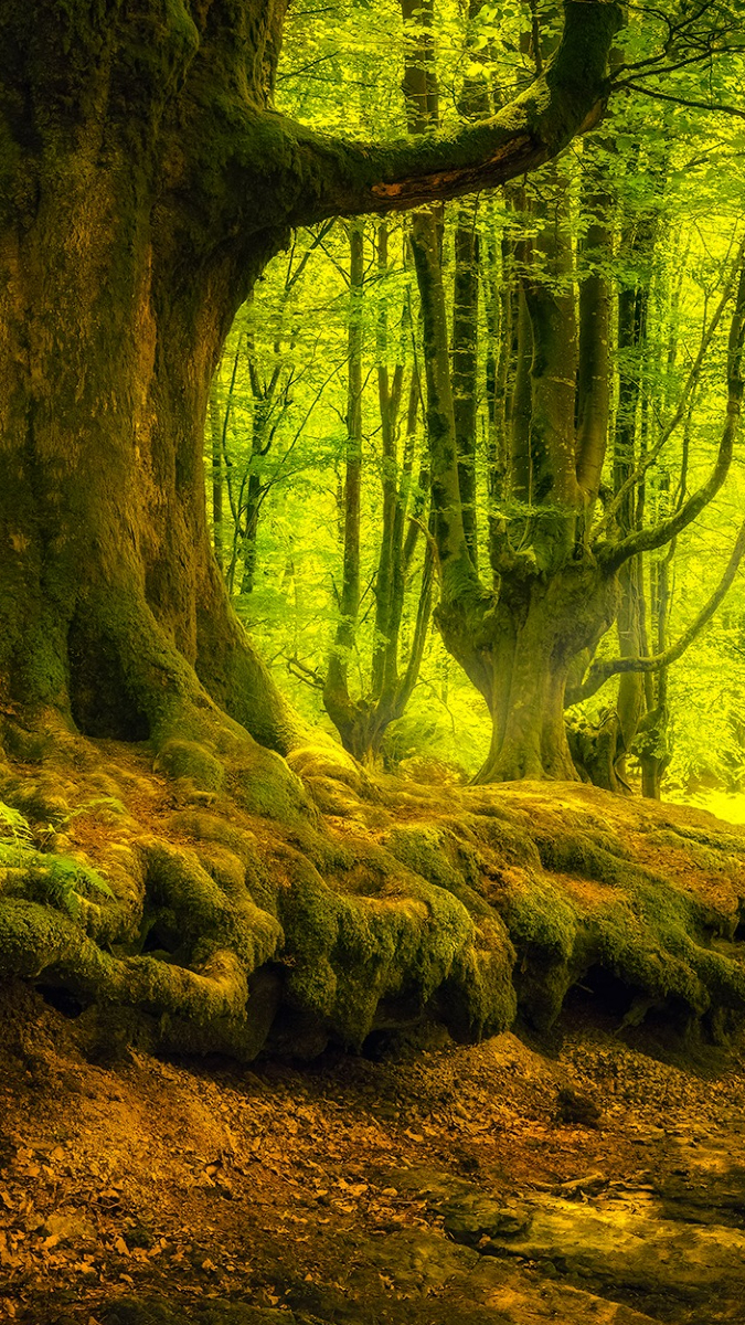 Edytor tapety: Omszałe drzewa z korzeniami w lesie