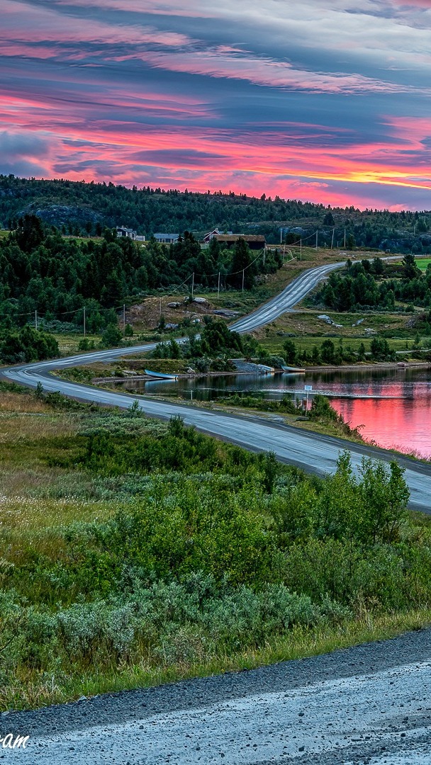 Edytor tapety: Kolorowe niebo nad lasem i drogą