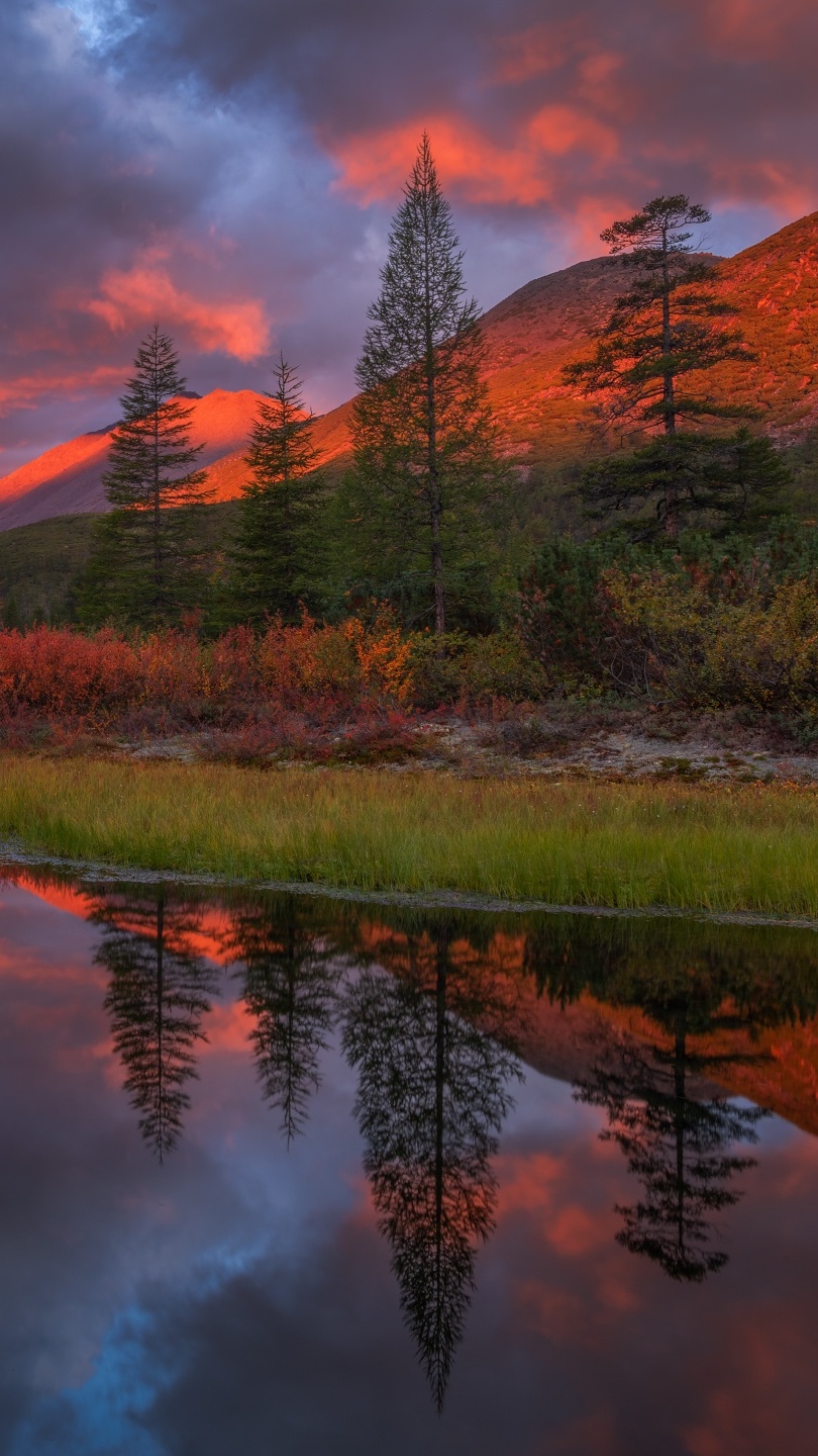 Edytor tapety: Rozświetlone góry nad jeziorem Jack London
