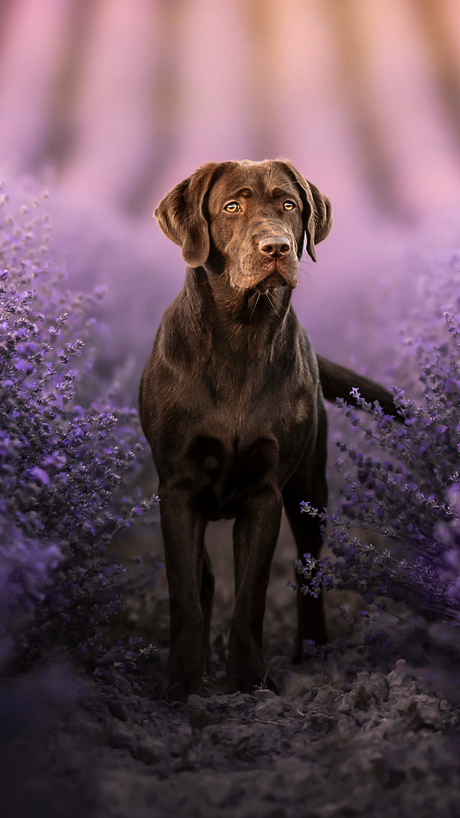 Edytor tapety: Labrador retriever na lawendowym polu