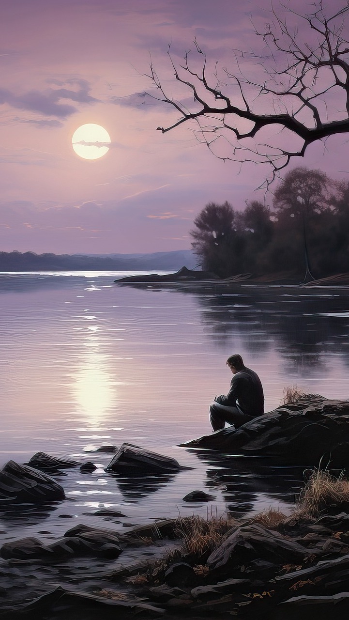 Edytor tapety: Mężczyzna siedzący nad jeziorem
