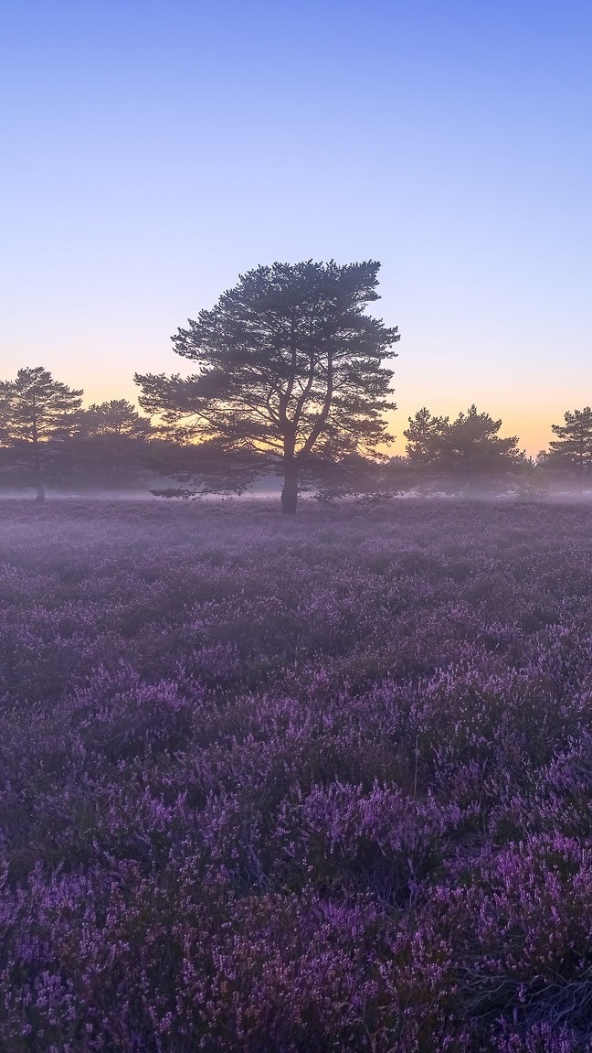 Edytor tapety: Drzewa na zamglonym wrzosowisku
