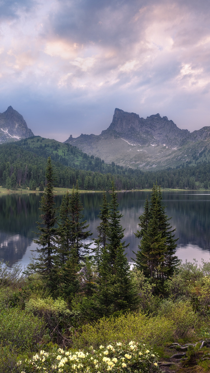 Edytor tapety: Góry i drzewa nad jeziorem