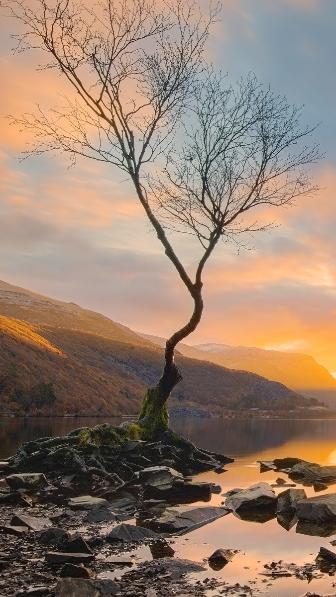 Edytor tapety: Samotne drzewo nad jeziorem Llyn Padarn