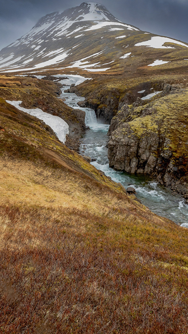 Edytor tapety: Potok wśród skał i ośnieżona góra