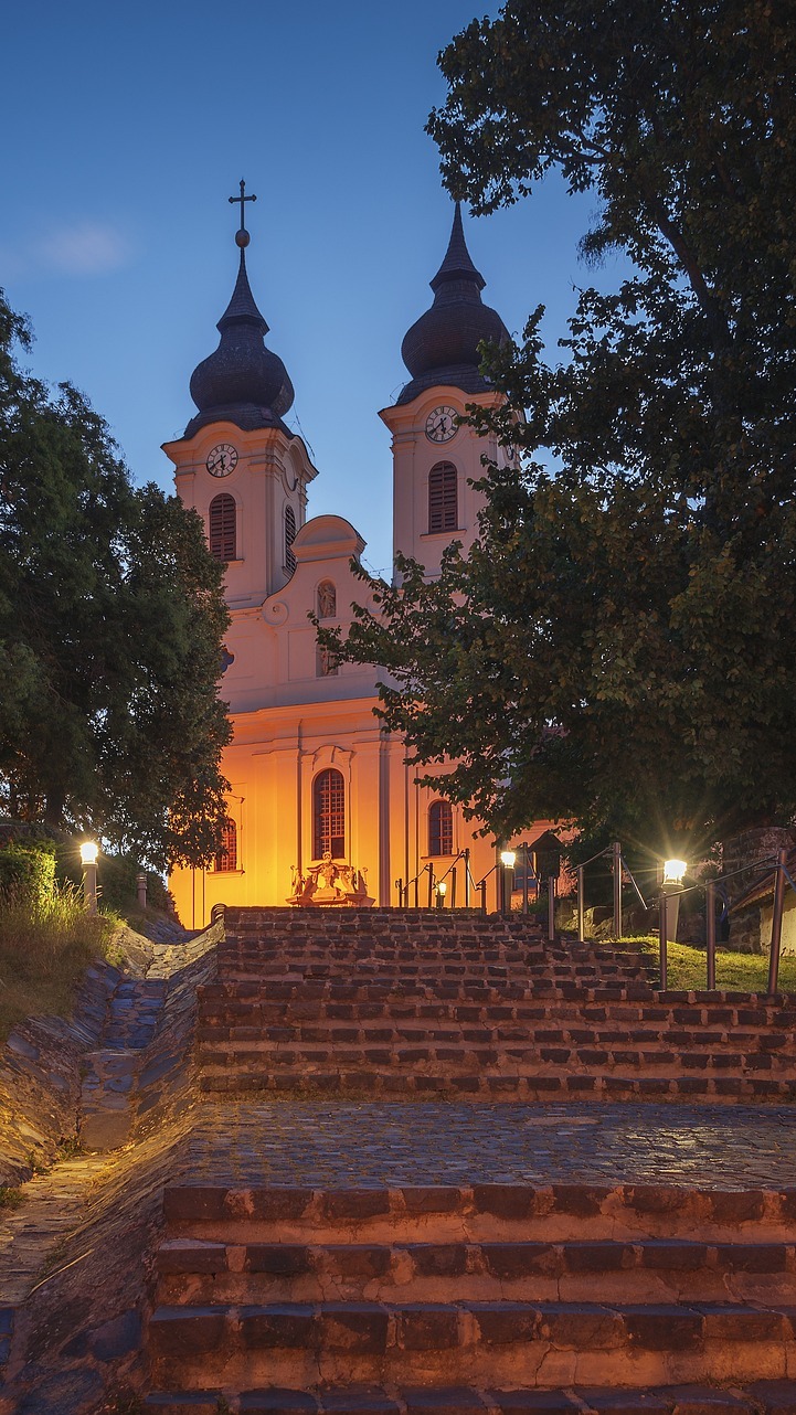Edytor tapety: Oświetlone schody do kościoła na wzgórzu