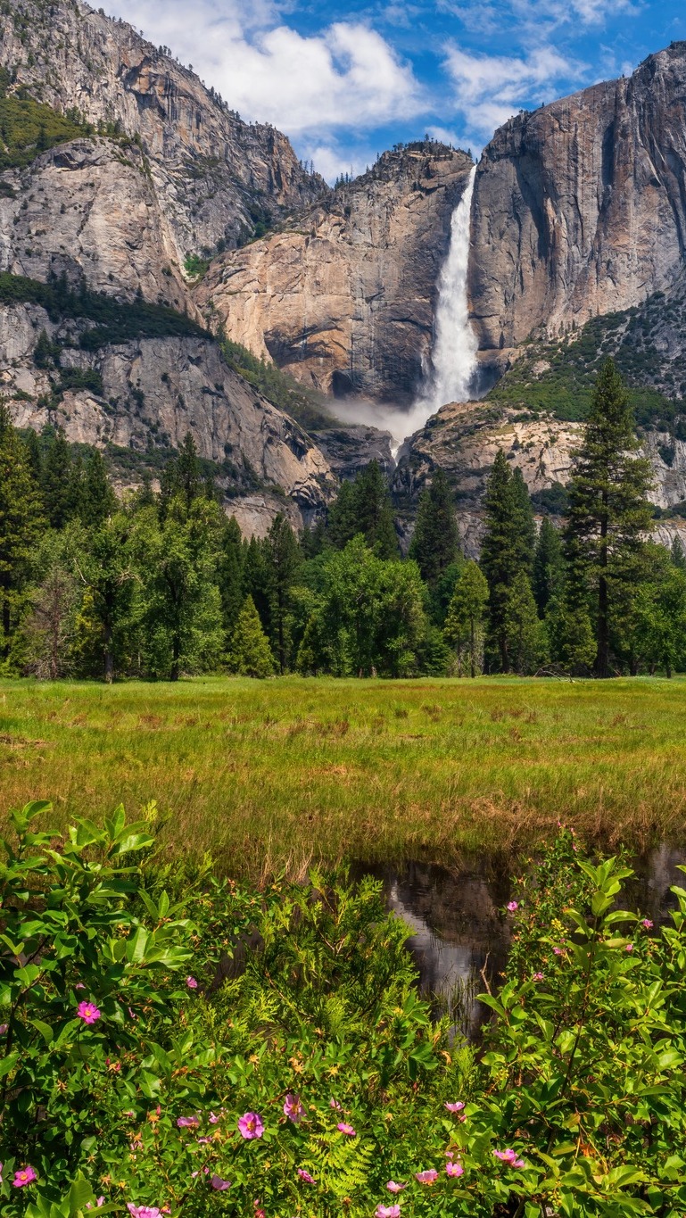 Edytor tapety: Łąka u podnóża gór z wodospadem