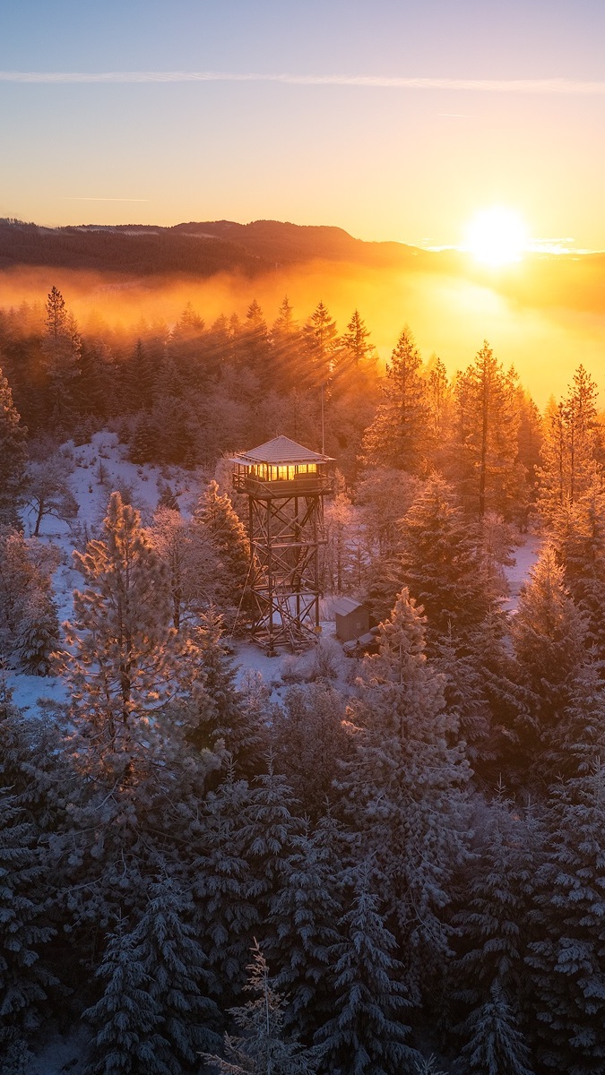 Edytor tapety: Zamglony wchód słońca nad lasem