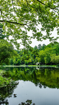 Edytor tapety: Zielone drzewa i pawilon nad rzeką