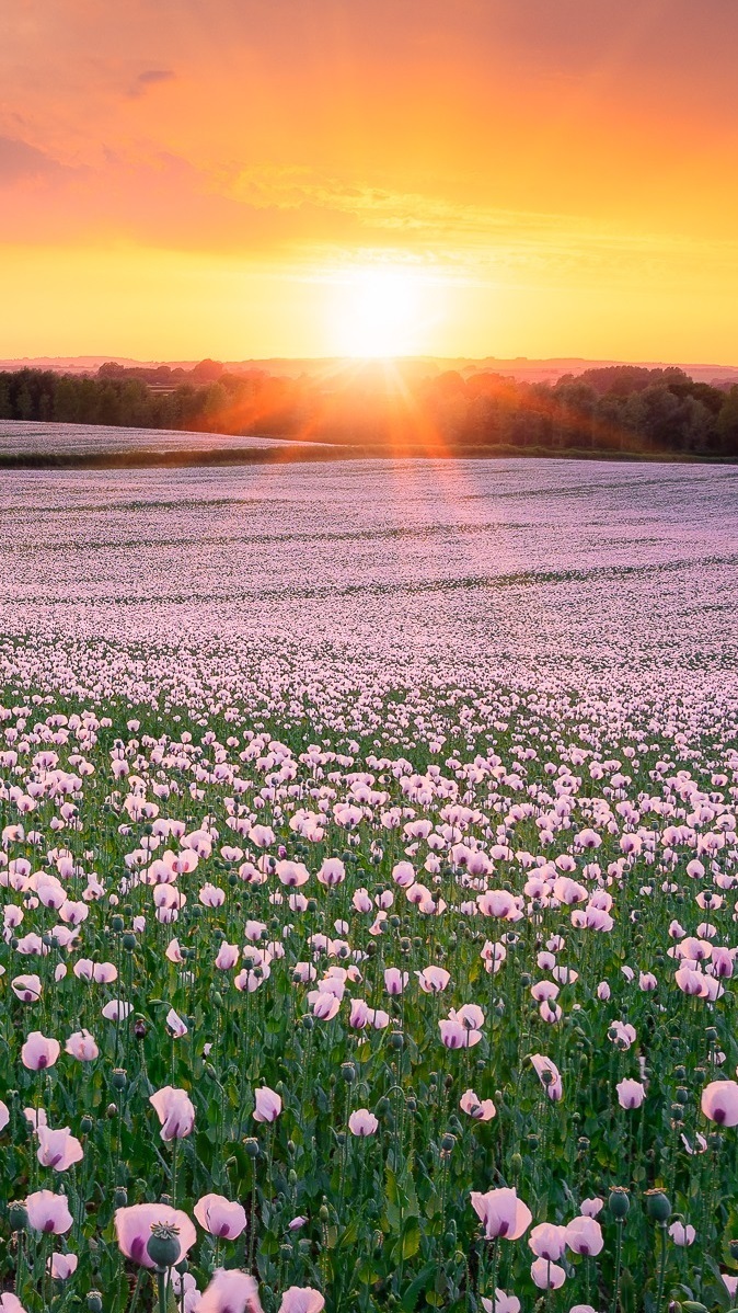 Edytor tapety: Pole maków w blasku wschodzącego słońca