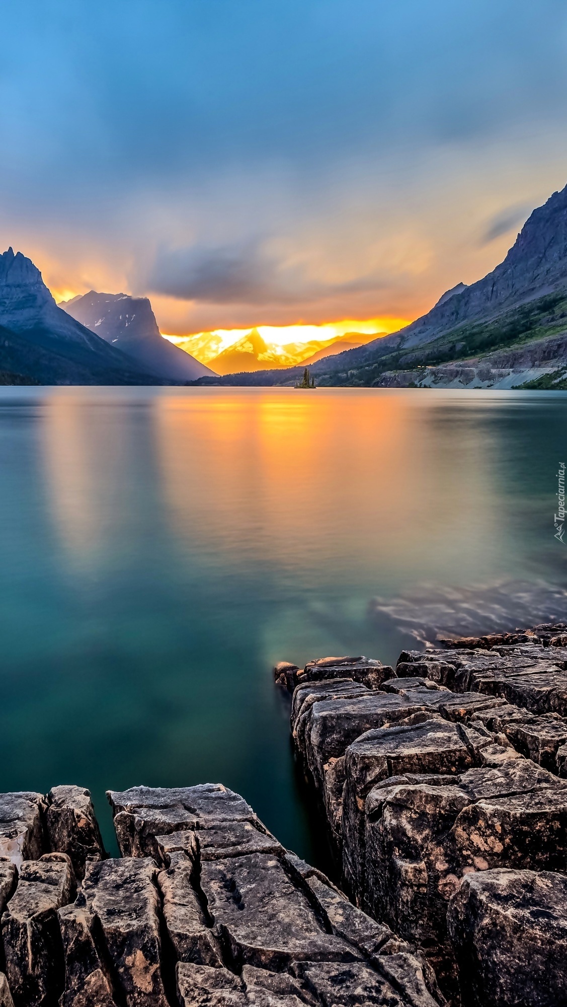 Edytor tapety: Rozświetlone niebo pomiędzy górami