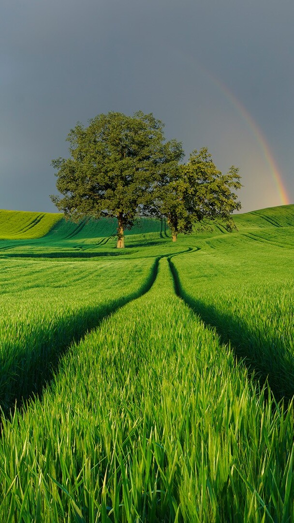 Edytor tapety: Tęcza nad drzewami na polu
