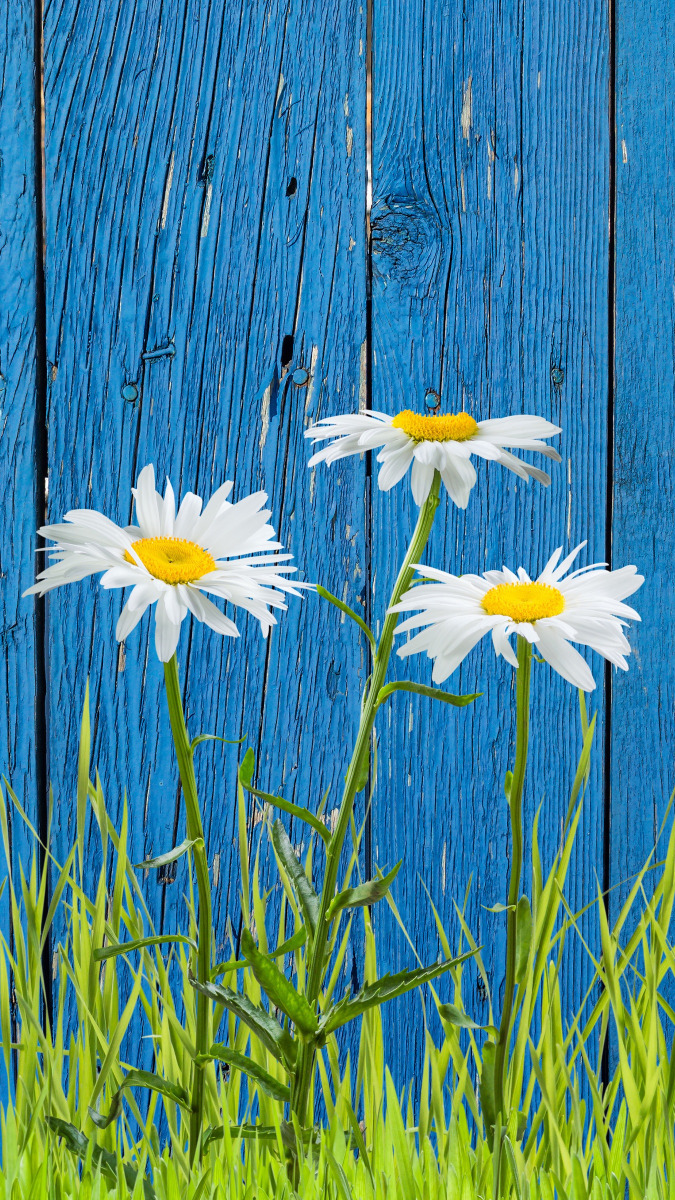 Edytor tapety: Stokrotki pod niebieskim płotem