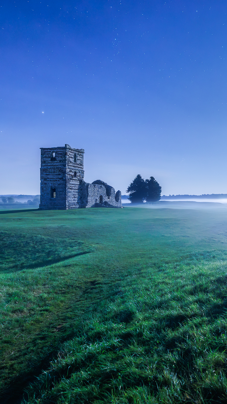 Edytor tapety: Ruiny kościoła na zamglonej łące