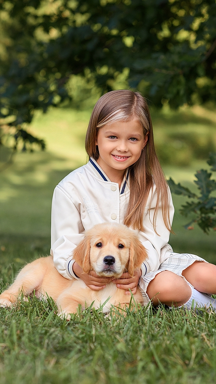 Edytor tapety: Uśmiechnięta dziewczynka ze szczeniakiem