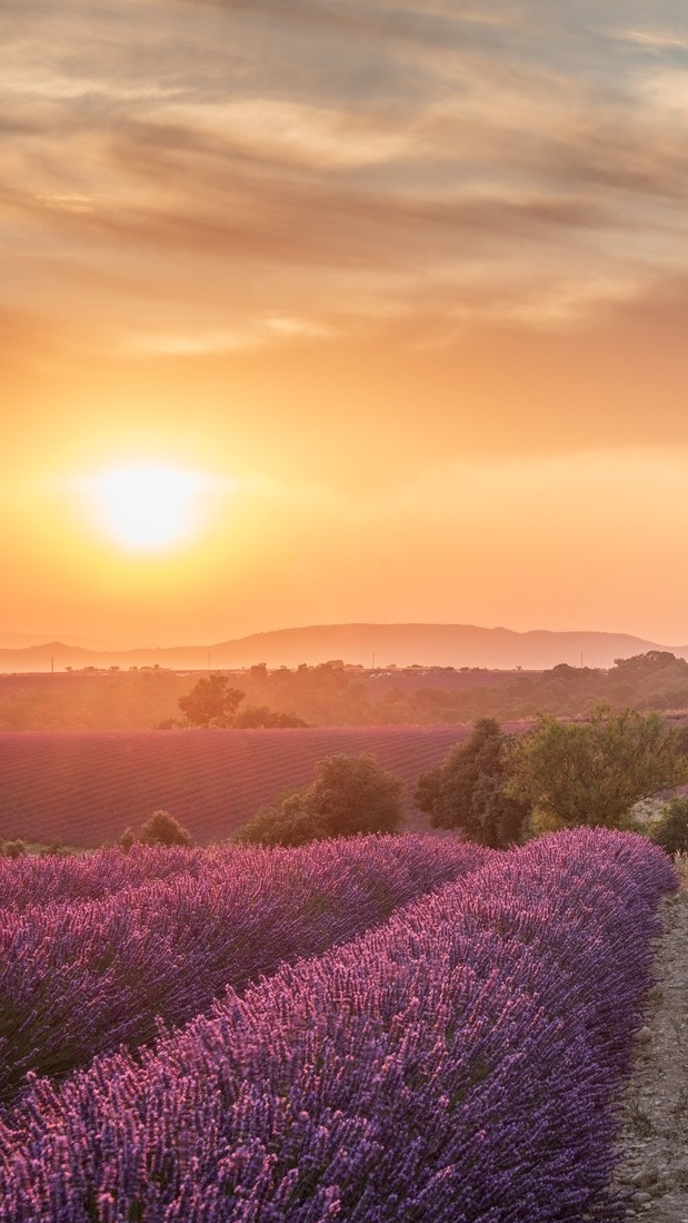 Edytor tapety: Pole lawendy w blasku wschodzącego słońca