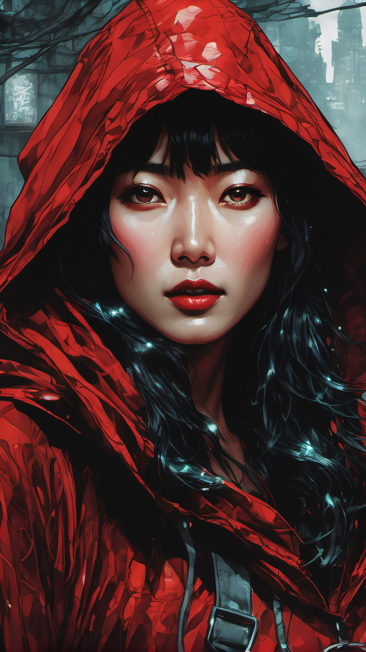 Edytor tapety: Azjatka w czerwonej pelerynie z kapturem