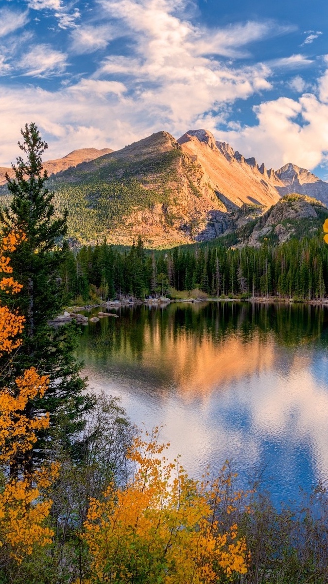 Edytor tapety: Drzewa i rozświetlona góra nad jeziorem