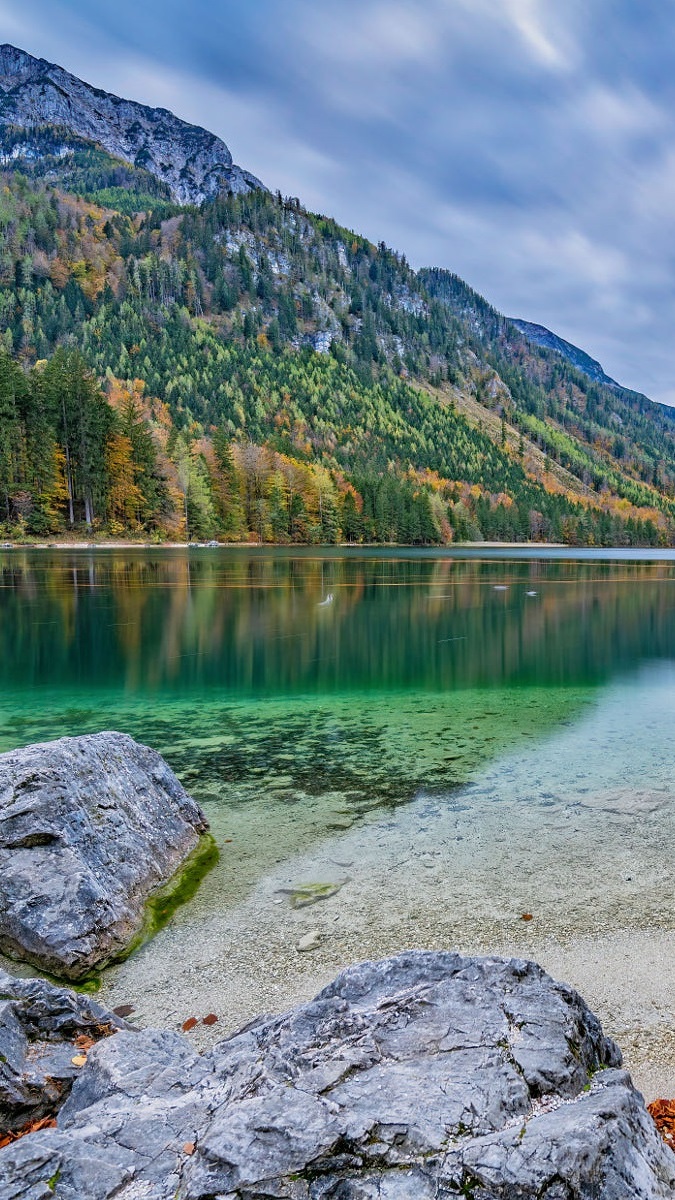 Edytor tapety: Zalesione góry nad jeziorem Langbathseen
