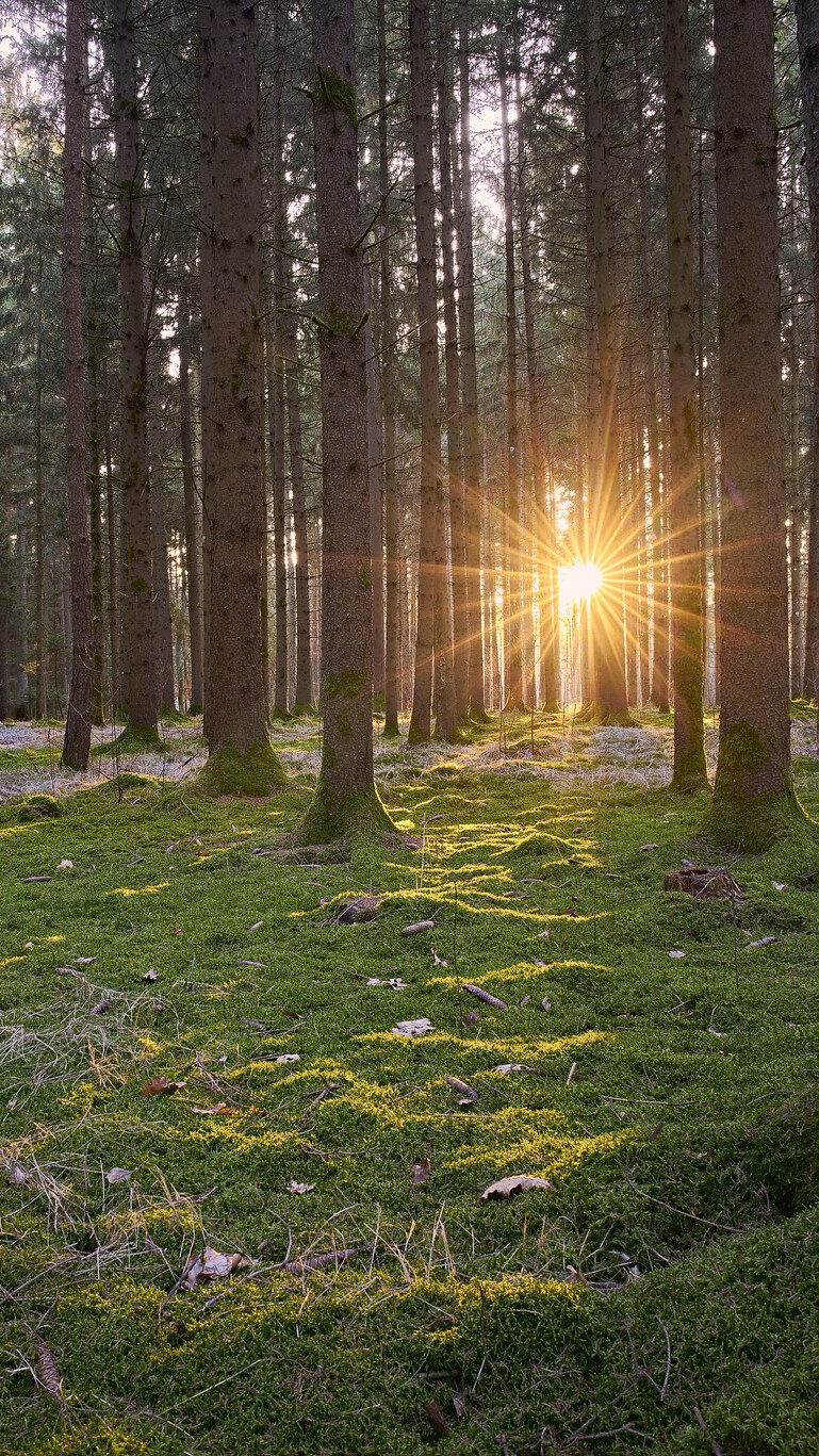 Edytor tapety: Promienie słoneczne między drzewami w lesie
