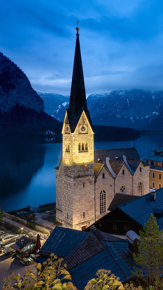 Edytor tapety: Oświetlony kościół w Hallstatt