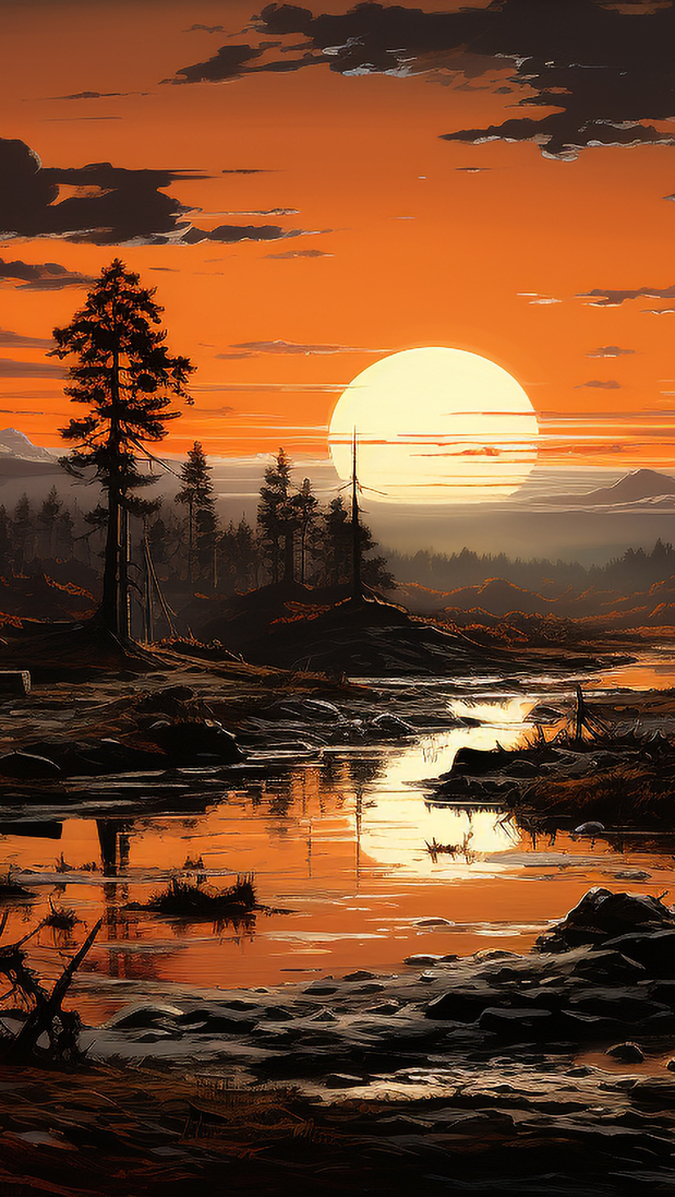 Edytor tapety: Zachód słońca nad rzeką w grafice