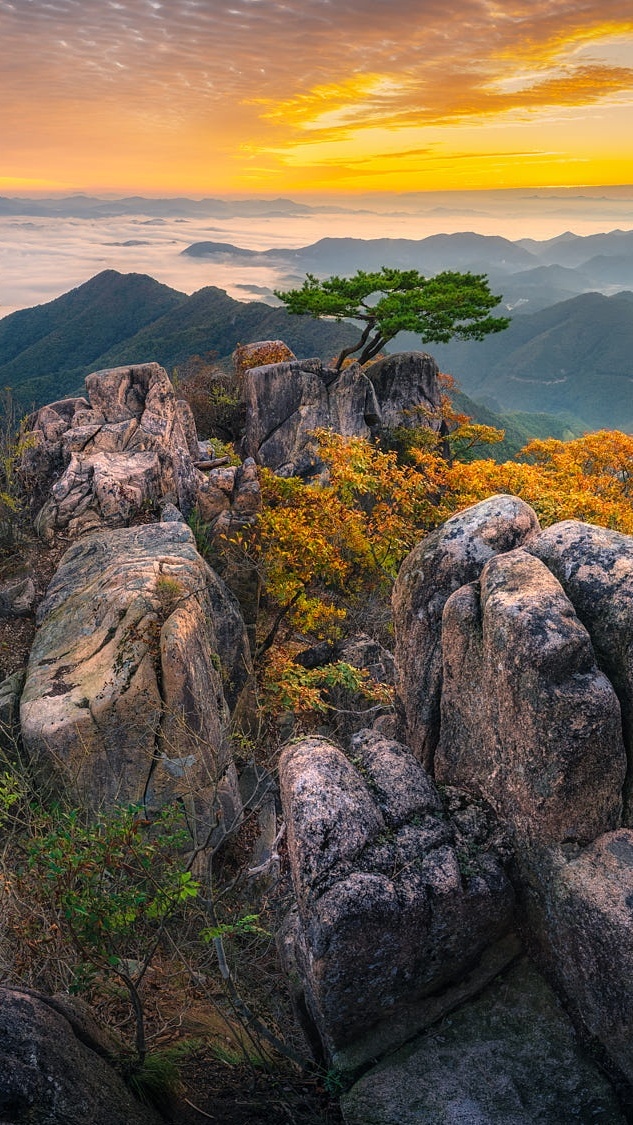 Edytor tapety: Sosna i jesienne drzewa na skałach