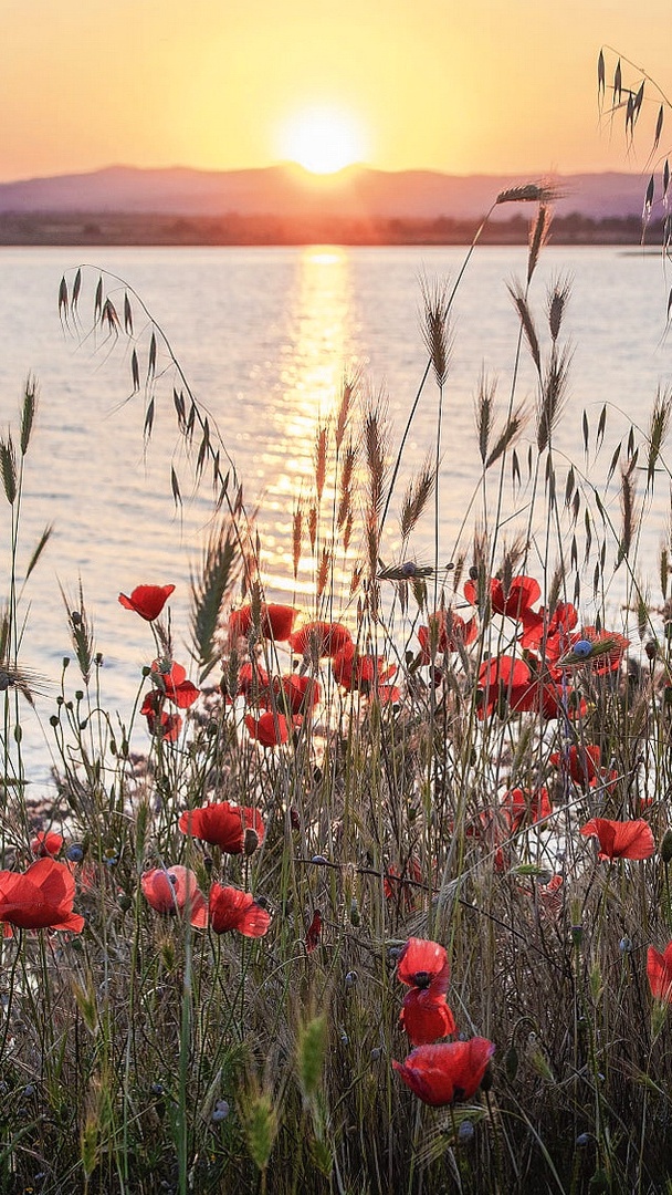 Edytor tapety: Czerwone maki na brzegu jeziora