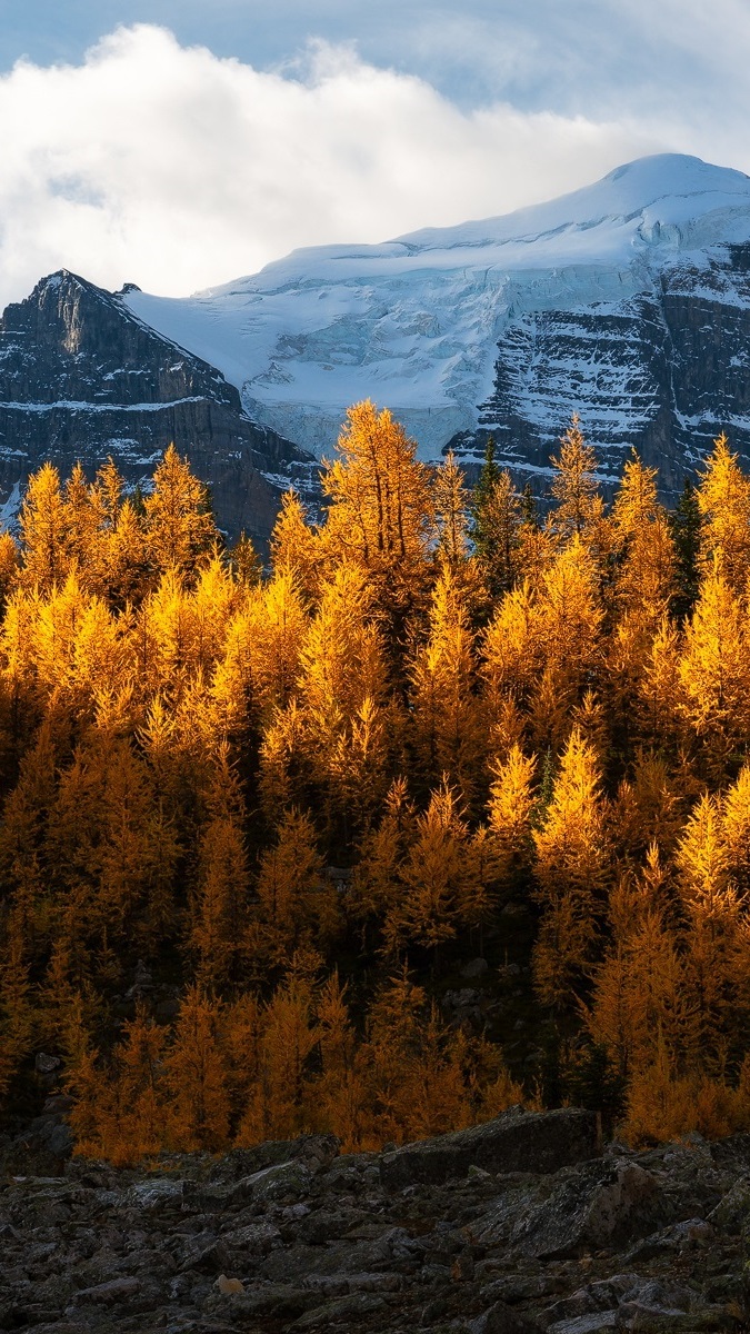 Edytor tapety: Pożółkłe drzewa na tle gór