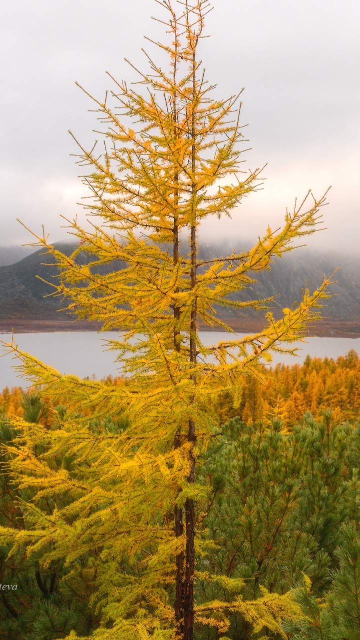 Edytor tapety: Pożółkłe modrzewie nad jeziorem Jack London