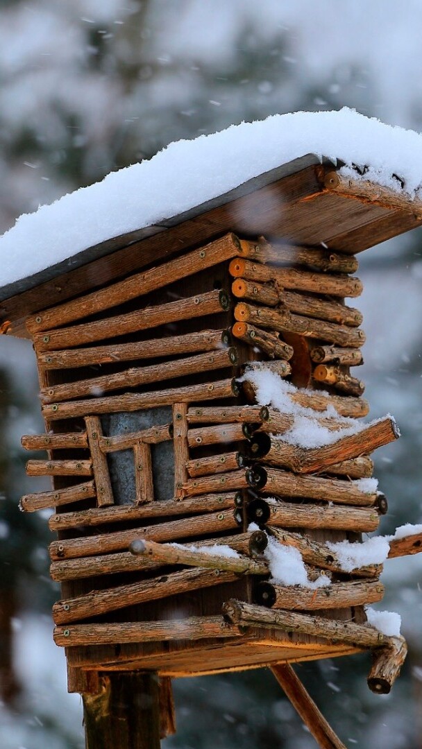 Edytor tapety: Ośnieżony drewniany domek dla ptaków