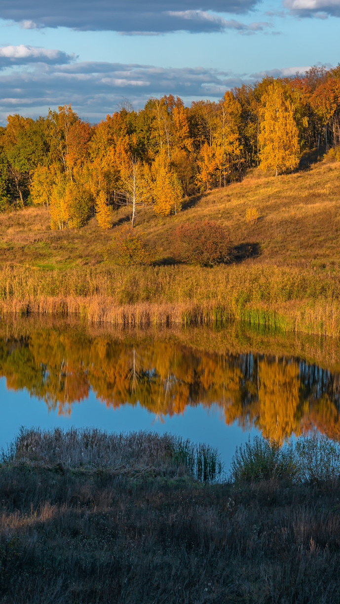 Edytor tapety: Pożółkłe drzewa na wzgórzu nad jeziorem