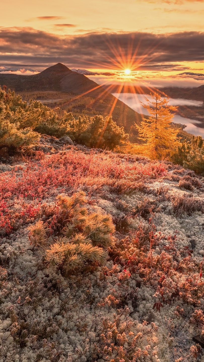 Edytor tapety: Słońce wśród jesiennych krzewów w górach