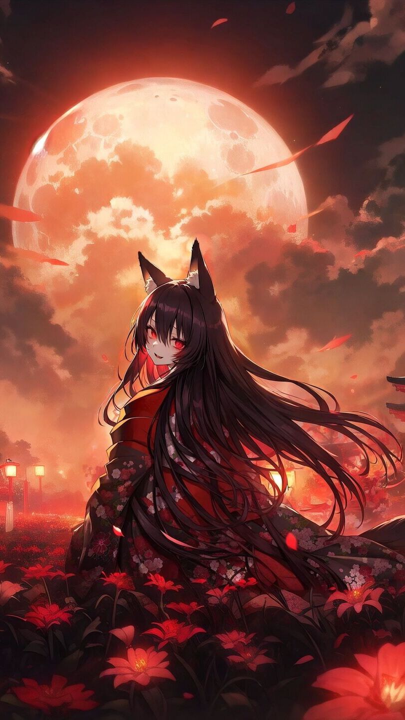 Edytor tapety: Neko wśród kwiatów na tle księżyca