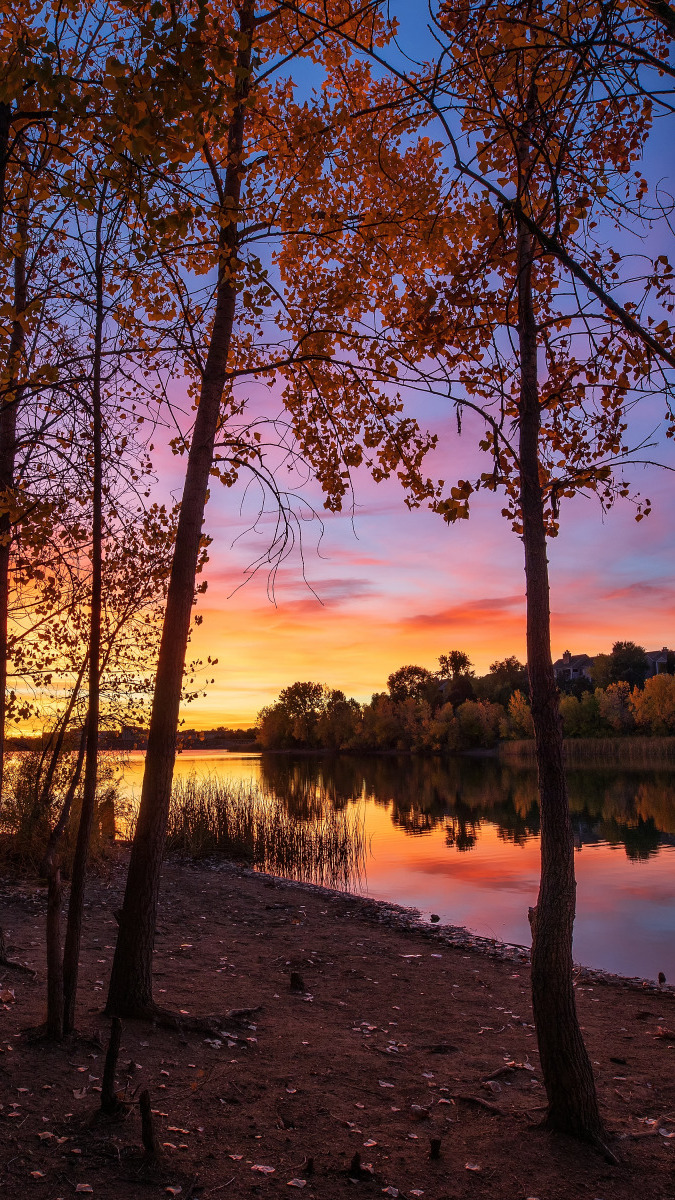 Edytor tapety: Zachód słońca nad lasem i jeziorem