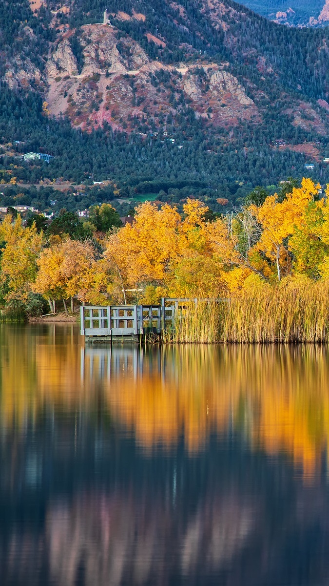 Edytor tapety: Jesienne drzewa przy górskim jeziorze