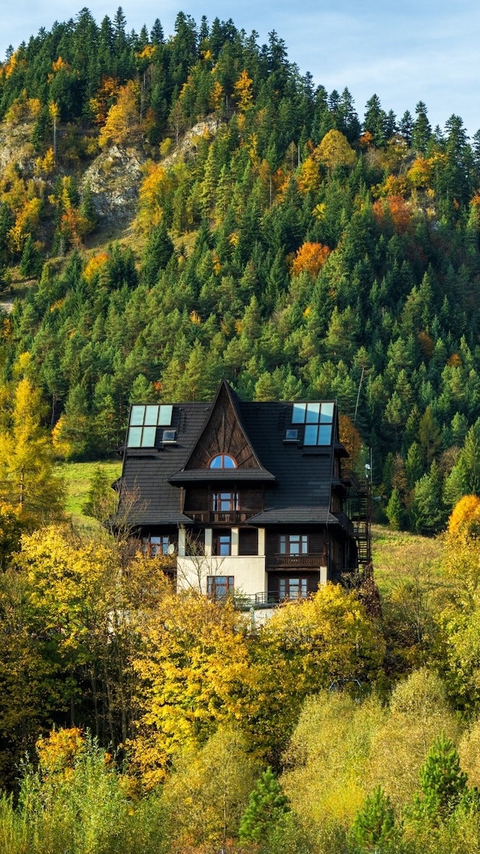 Edytor tapety: Dom na tle zalesionej góry