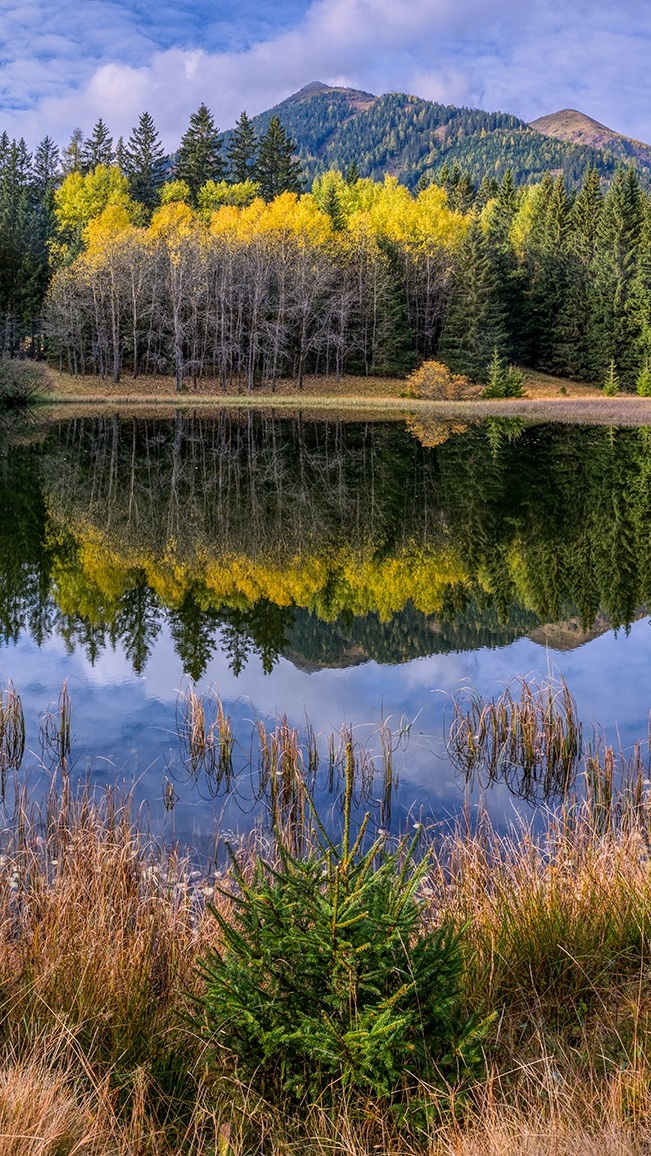 Edytor tapety: Odbicie lasu i gór w jeziorze