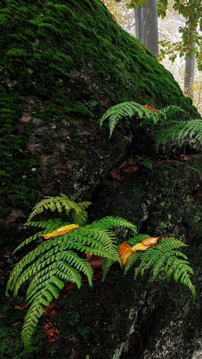 Edytor tapety: Paprocie na omszałej skale w lesie