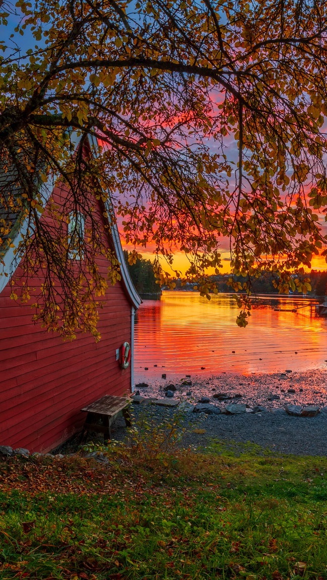 Edytor tapety: Dom pod drzewem na brzegu jeziora